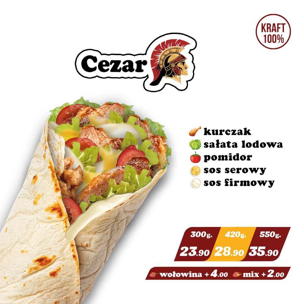 Kurczak, sałatka Lodowa, pomidor , serowy sos , firmowy sos.